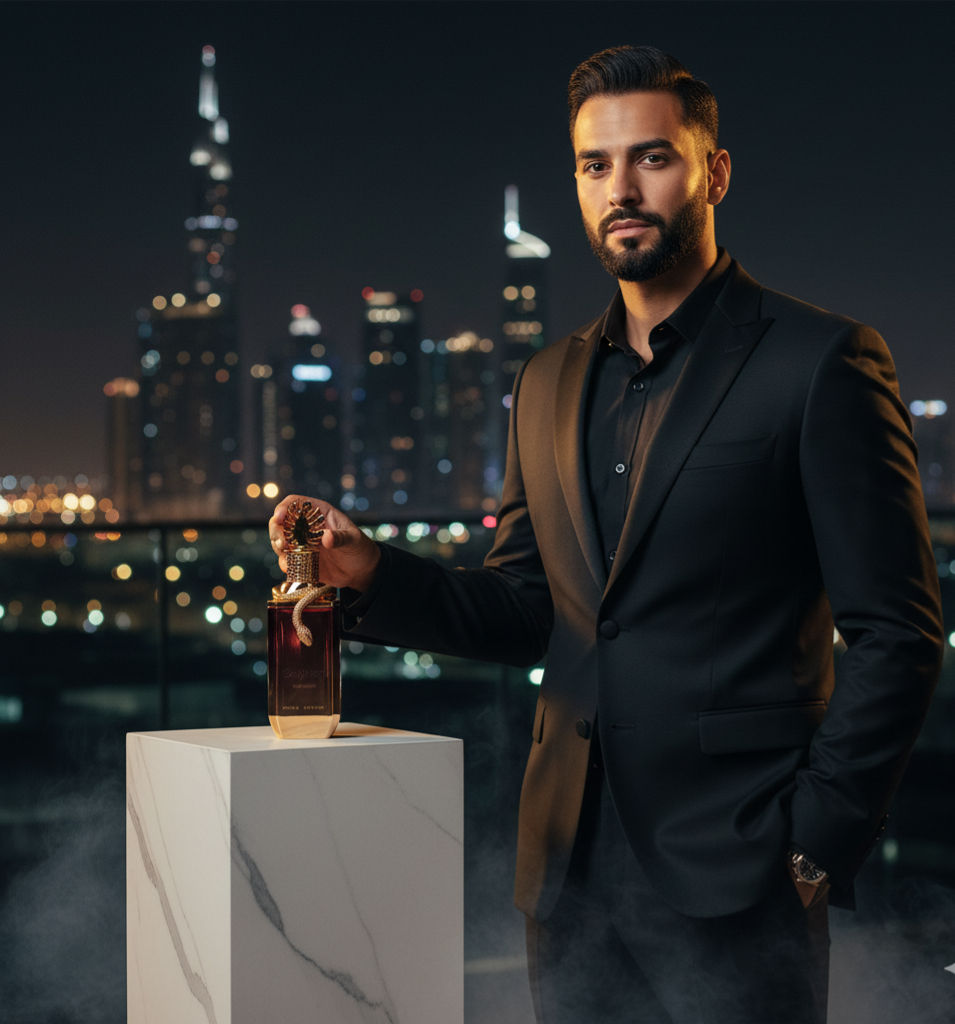 Après l’ouverture, la fragrance gagne en profondeur. Un accord praliné se fond sur la peau, rejoint par une rose légèrement épicée et un héliotrope discret. Cet équilibre donne un côté séduisant et audacieux, sans perdre l’élégance masculine. C’est une composition moderne, luxueuse, pensée pour l’homme qui veut laisser une trace olfactive mémorable.