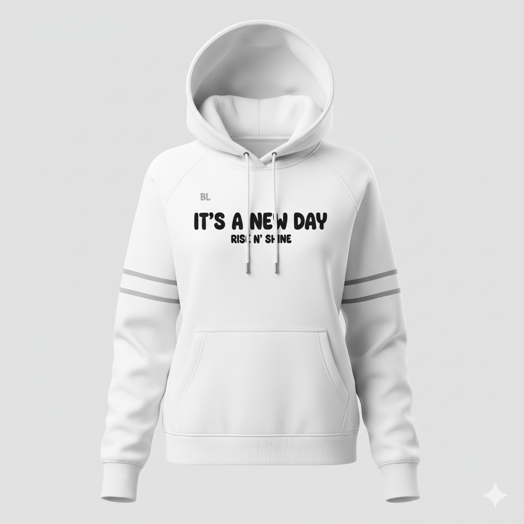 Sur la poitrine, le logo discret BL incarne l’authenticité de la marque, tandis que le message imprimé “IT’S A NEW DAY – RISE N’ SHINE” transforme cette pièce en véritable déclaration de motivation.