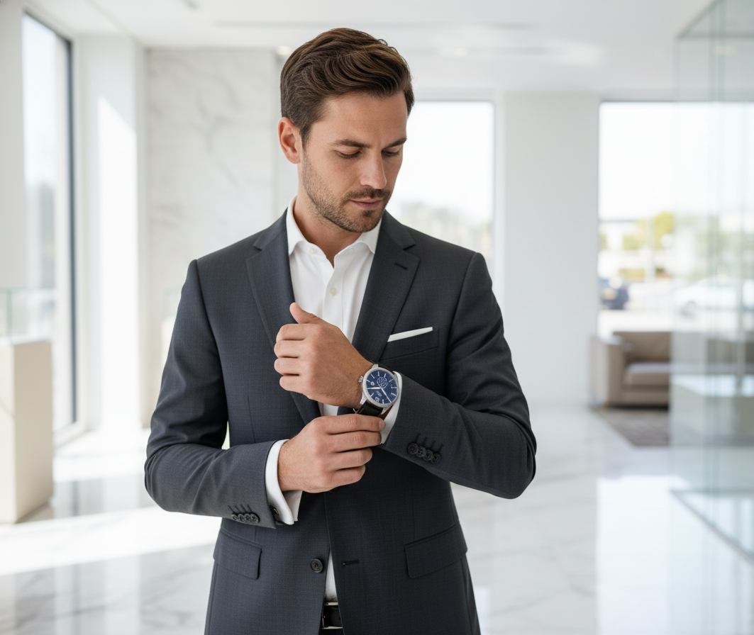 Le boîtier en acier inoxydable chirurgical assure une résistance parfaite à la corrosion et aux micro-rayures, tandis que le bracelet en cuir noir à fermoir invisible offre une ligne continue et sophistiquée autour du poignet.